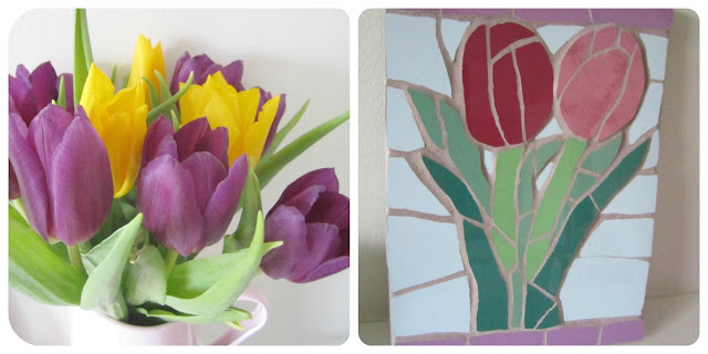 I particularly adore tulips. When I saw this post of Lucy's, I fell head over heels in love with her new mosaic tile and hotfooted it straight over to Felicity's shop on Folksy for a look see. This morning, my very own tulip tile came thudding through the letterbox.
